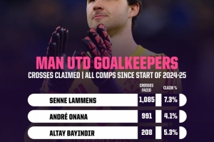 2024-25赛季以来,拉门斯共1085次面对传中球,他摘传中球成功率为7.3%;奥纳纳991次面对传中球,摘传中球成功率为4.1%;而巴延德尔则是208次面对传中球,摘传中球成功率为5.3%。