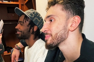 据记者晒照,申京赛后在更衣室搂着伊森接受采访,后者则满脸笑容。
