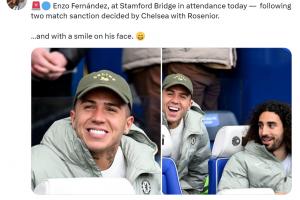 罗马诺晒照并写道:“在罗塞尼尔决定对他处罚两场禁赛后,恩佐今天来到斯坦福桥看球。”