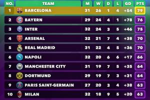 体育资讯04月13日讯 欧洲五大联赛已经进入最后冲刺阶段,Score90统计了五大联赛合并的积分榜,表格从左至右分别为比赛场数、胜、平、负、净胜球以及积分。巴萨以79分位居第一,拜仁第二,国米第三,阿森纳第四。